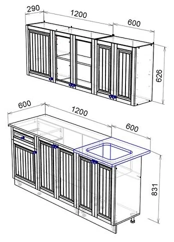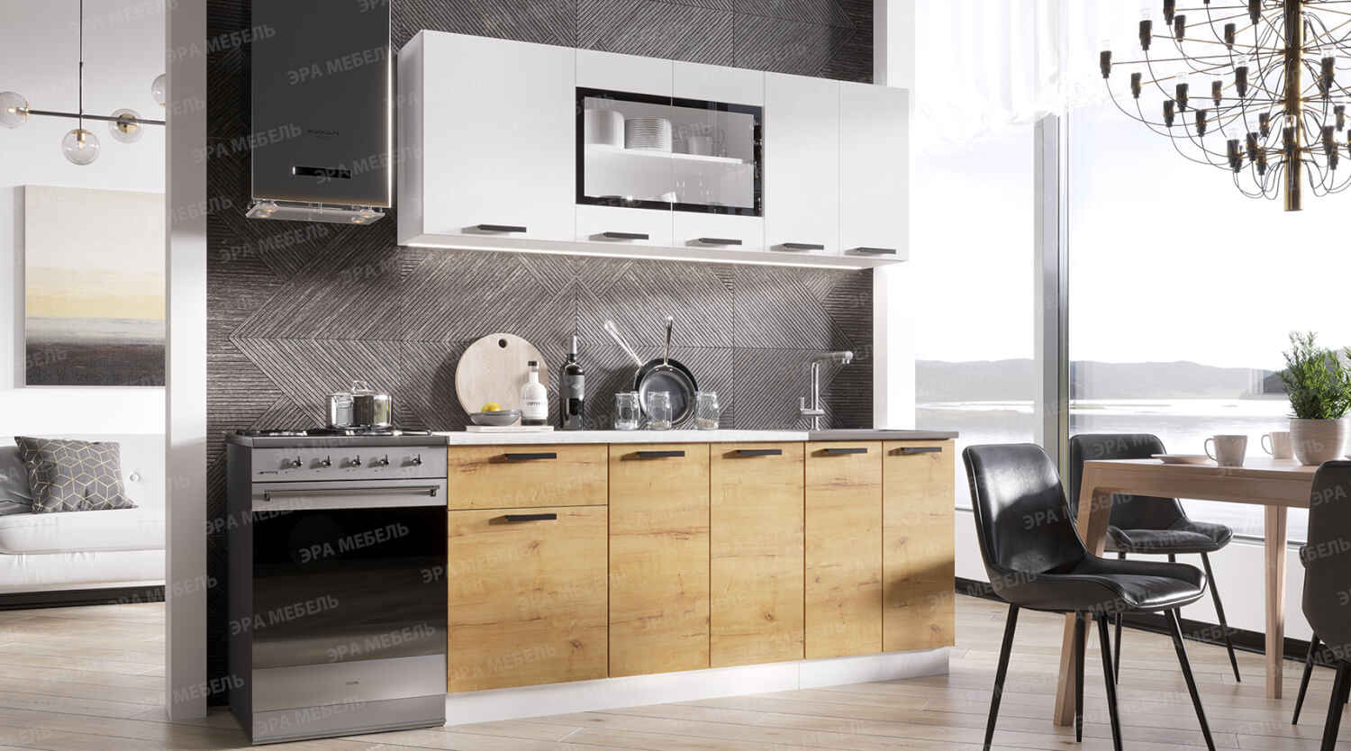 Цвет: Белый/ Дуб Вотан Материал фасада: ЛДСП / стекло Материал корпуса: ЛДСП Длина нижних шкафов: 180 см Длина верхних шкафов: 180 см Глубина нижних шкафов: 42 см Глубина верхних шкафов: 29 см Высота нижних шкафов: 83.1 см Высота верхних шкафов: 62.6 см Столешница 1200 идёт в комплекте.