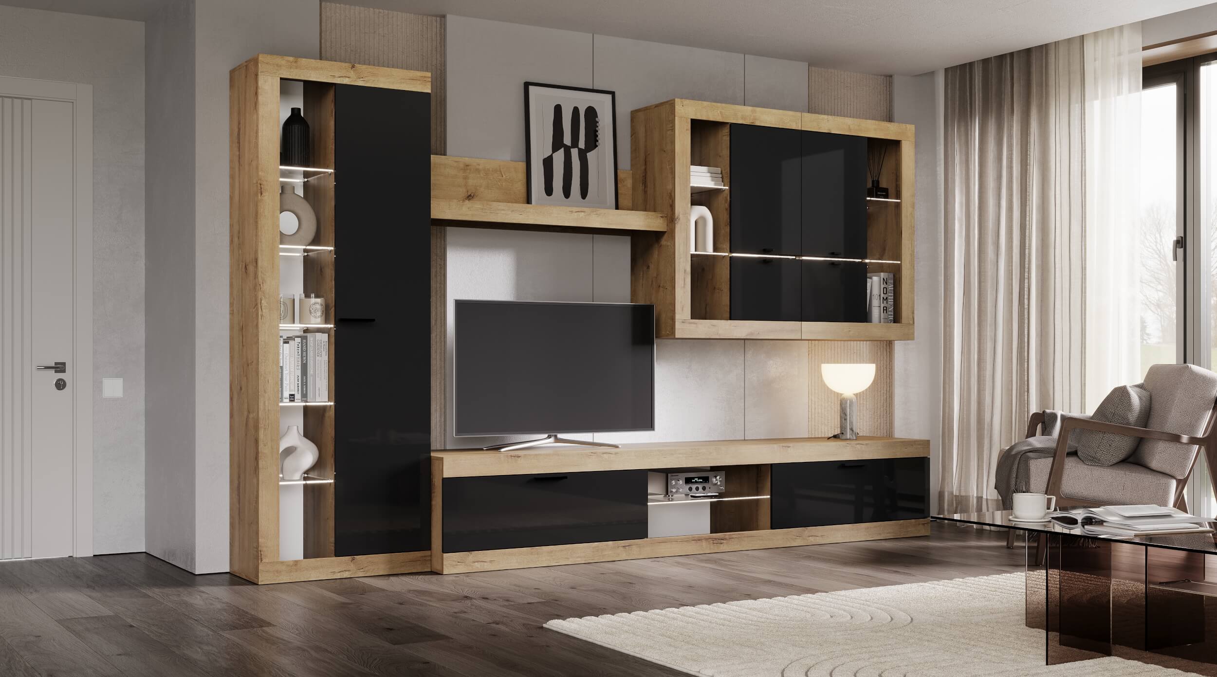 Гостиная Прага Цвет: Дуб Вотан/ Графит Цвет: Дуб Делано/ Графит. Цвет: Дуб Делано/Белый глянец. Цвет: Дуб Делано/Чёрный глянец. Цвет: Дуб Вотан/ Белый Глянец. Цвет: Дуб Вотан/ Чёрный глянец В комплекте: Витрина универсальная 666(Ш) х 1034(В) х 376(Г) Шкаф-витрина 666(Ш) х 1940(В) х 376(Г) Полка навесная 1190(Ш)х264(В)х212(Г) Тумба ТВ большая 2522(Ш) х 460(В) х 426(Г) Общая ширина 3,22. Материал ЛДСП. НОВАЯ КОЛЛЕКЦИЯ, НОВЫЙ ЦВЕТ. В НАЛИЧИИ.