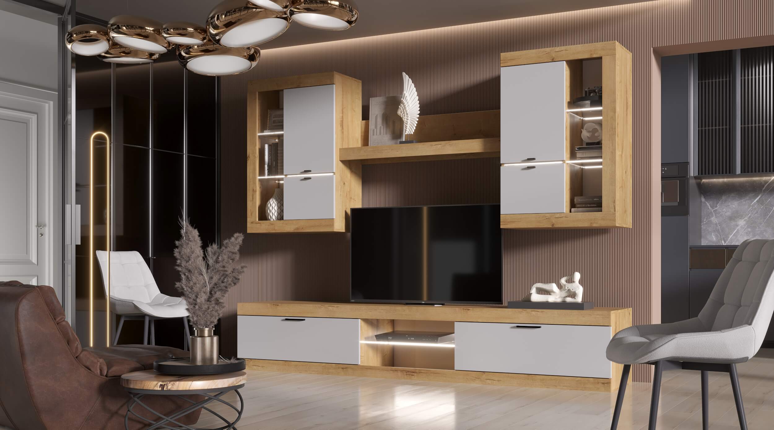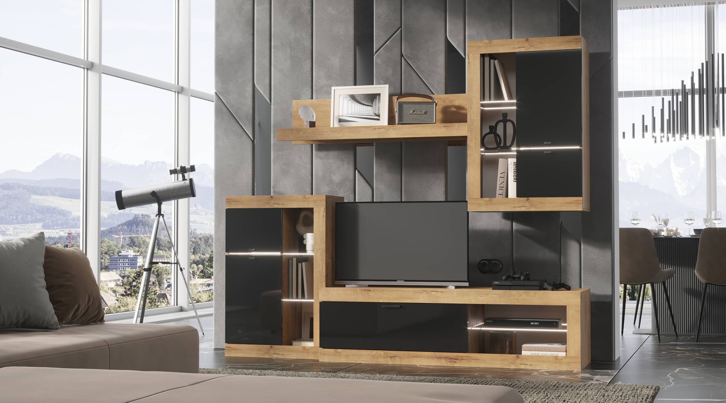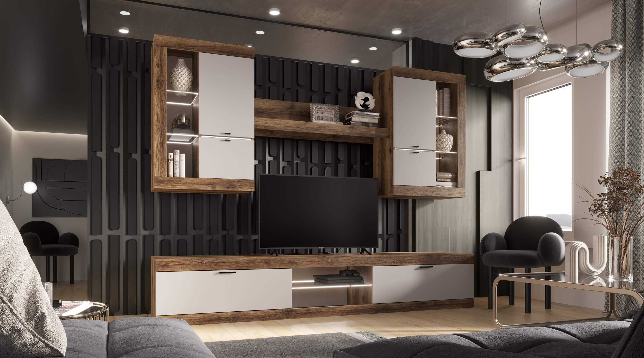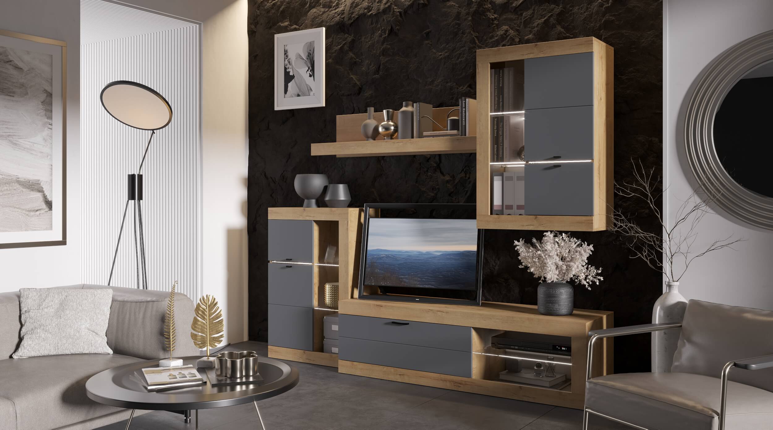 Гостиная Прага Цвет: Дуб Вотан/Белый гладкий Цвет: Дуб Вотан /Графит Цвет: Дуб Делано/Белый глянец Дуб Делано /Чёрный глянец В комплекте : Витрина универсальная 666(Ш) х 1034(В) х 376(Г)- 2 шт. Полка навесная 1190(Ш)х264(В)х212(Г) Тумба ТВ большая 2522(Ш) х 460(В) х 426(Г) Новый цвет, новая коллекция. Всё в наличии.