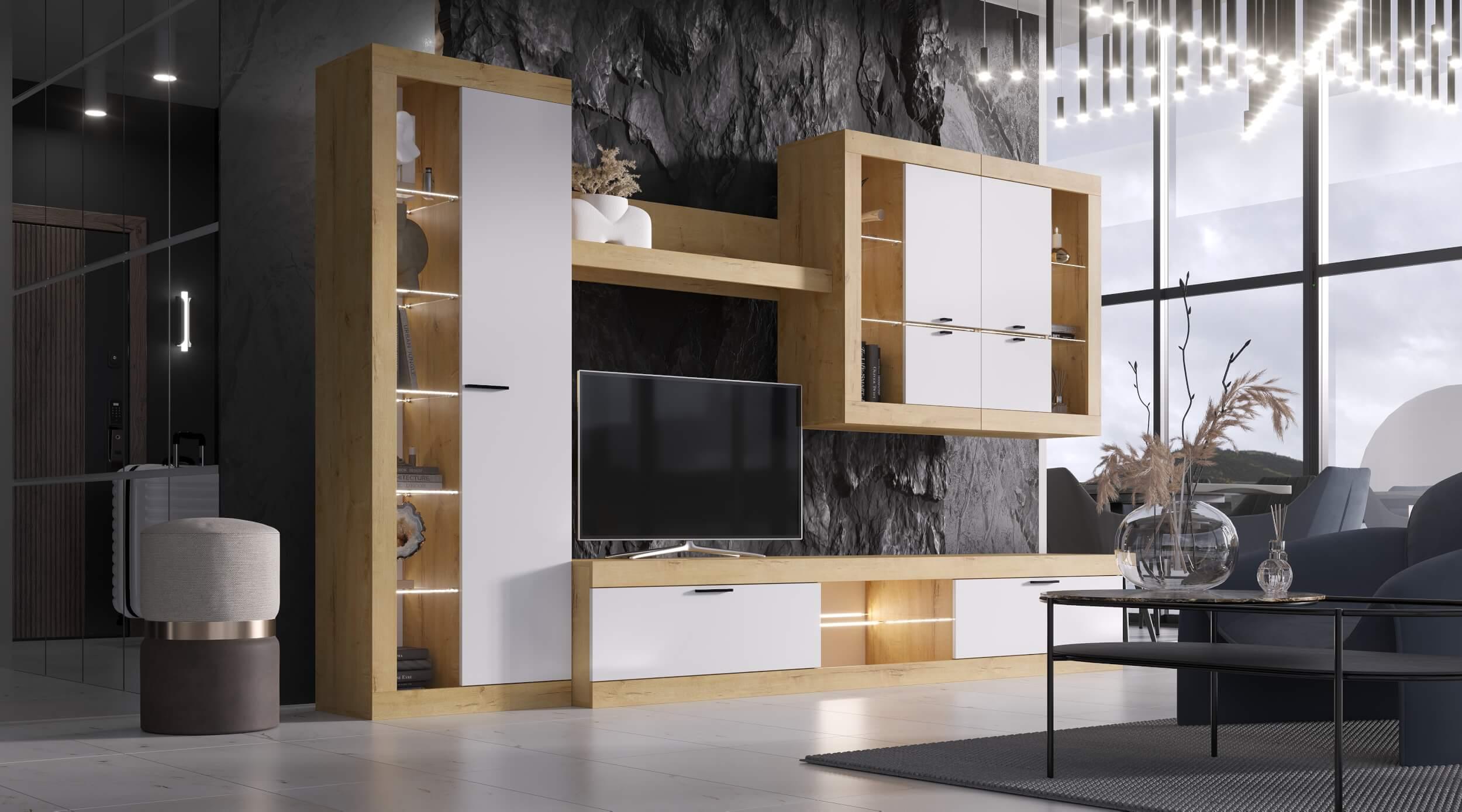 Цвет: Дуб Вотан/Белый гладкий Шкаф-витрина 667(Ш) х 1940(В) х 376(Г) Витрина универсальная 667(Ш) х 1034(В) х 376(Г) Полка навесная 1190(Ш)х264(В)х212(Г) Тумба ТВ большая 2522(Ш) х 460(В) х 426(Г)
