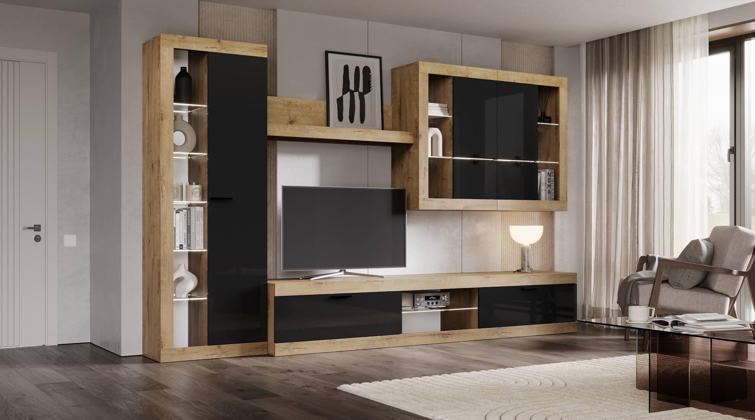 Цвет: Дуб Вотан/Черный глянец Шкаф-витрина 667(Ш) х 1940(В) х 376(Г) Витрина универсальная 667(Ш) х 1034(В) х 376(Г) Полка навесная 1190(Ш)х264(В)х212(Г) Тумба ТВ большая 2522(Ш) х 460(В) х 426(Г)