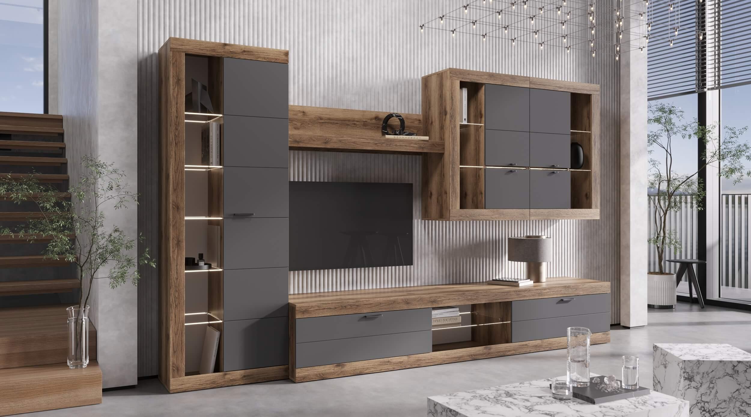 Цвет: Дуб Делано/Графит Шкаф-витрина 667(Ш) х 1940(В) х 376(Г) Витрина универсальная 667(Ш) х 1034(В) х 376(Г) Полка навесная 1190(Ш)х264(В)х212(Г) Тумба ТВ большая 2522(Ш) х 460(В) х 426(Г)