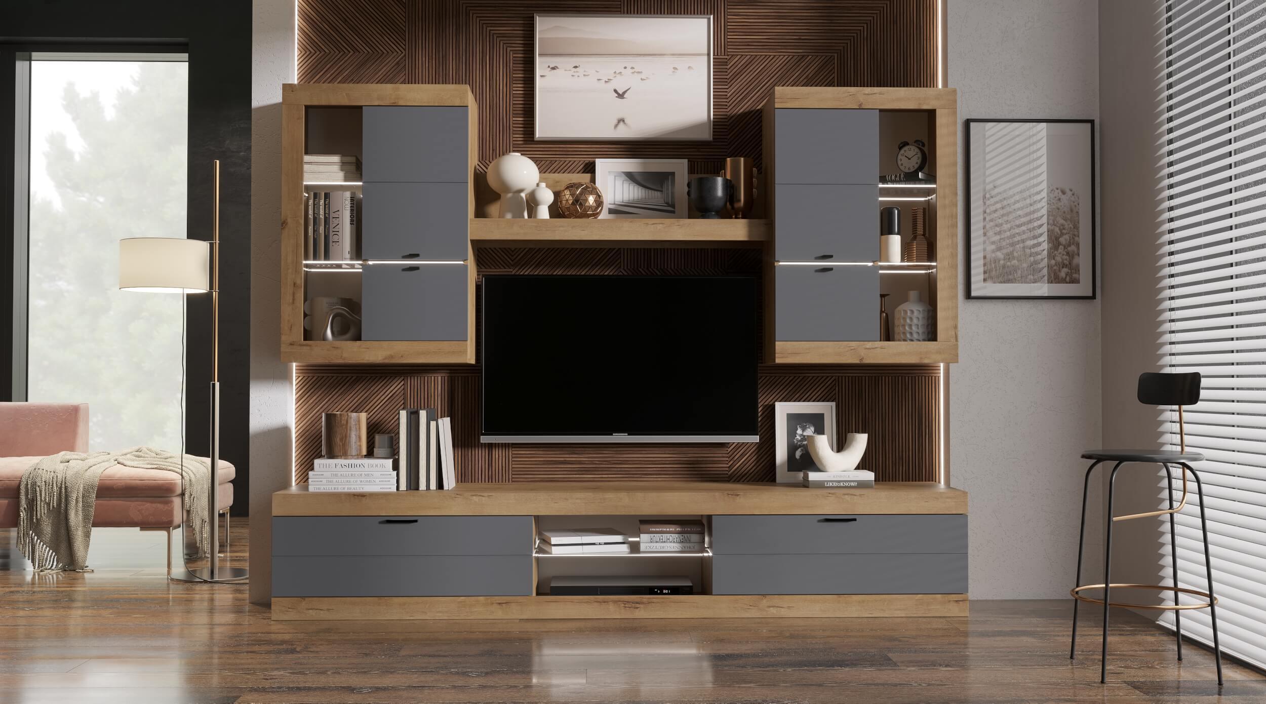 Цвет: Дуб Вотан/Графит Витрина универсальная 667(Ш) х 1034(В) х 376(Г) Полка навесная 1190(Ш)х264(В)х212(Г) Тумба ТВ большая 2522(Ш) х 460(В) х 426(Г)