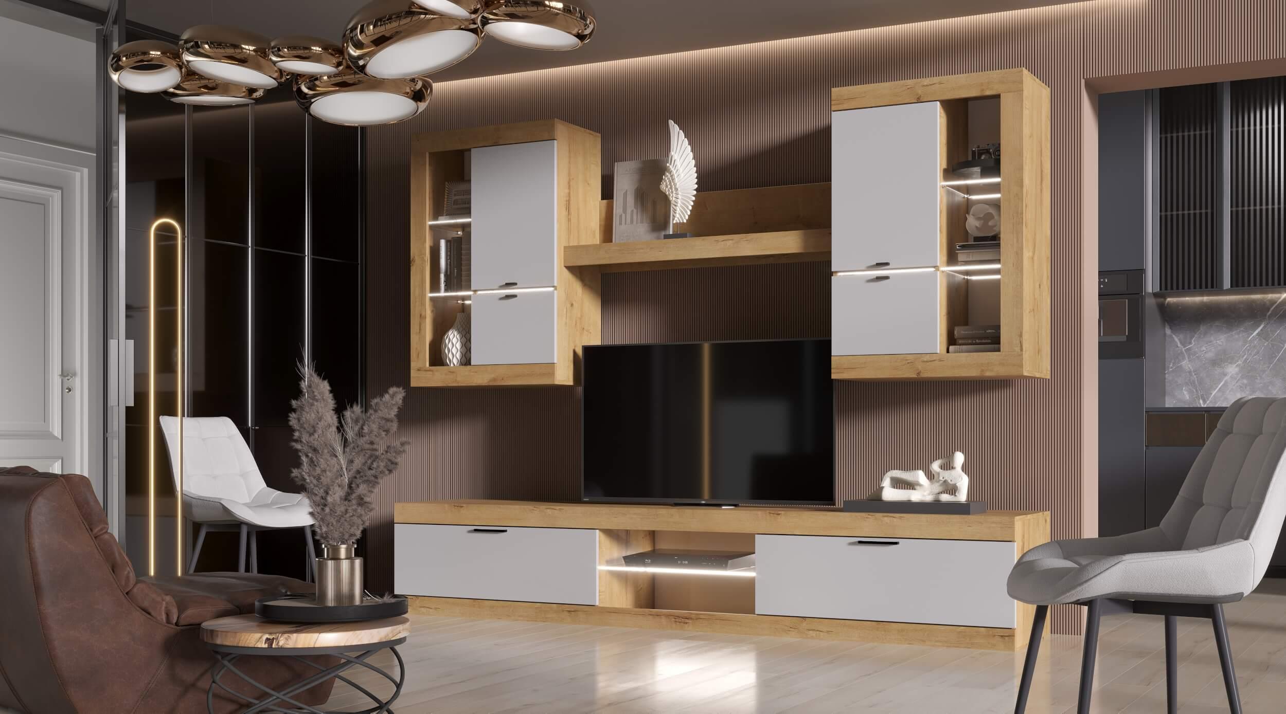 Цвет: Дуб Вотан/Белый гладкий Витрина универсальная 667(Ш) х 1034(В) х 376(Г) Полка навесная 1190(Ш)х264(В)х212(Г) Тумба ТВ большая 2522(Ш) х 460(В) х 426(Г)